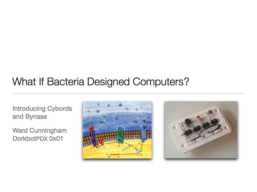 We presented What if Bacteria Designed Computers at DorkbotPdx 0x01 to standing room only. Slides and video are available.