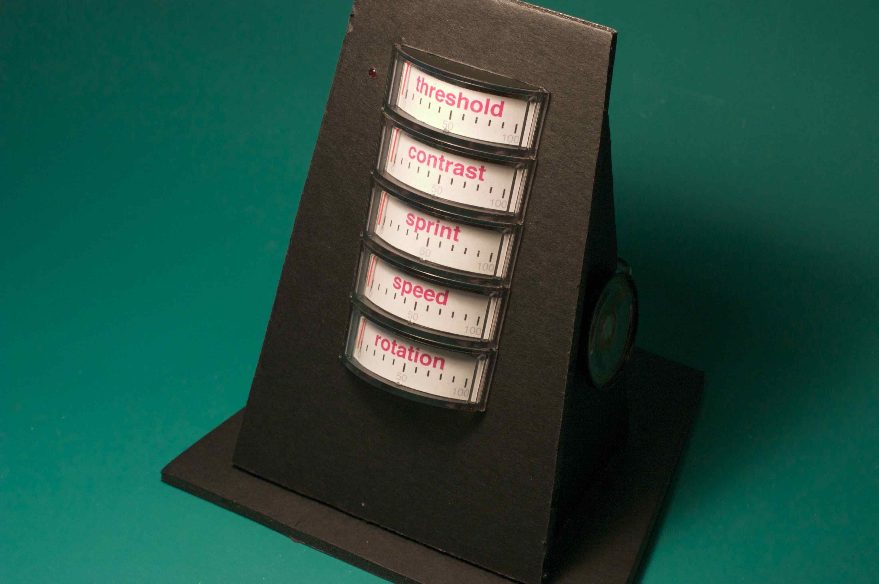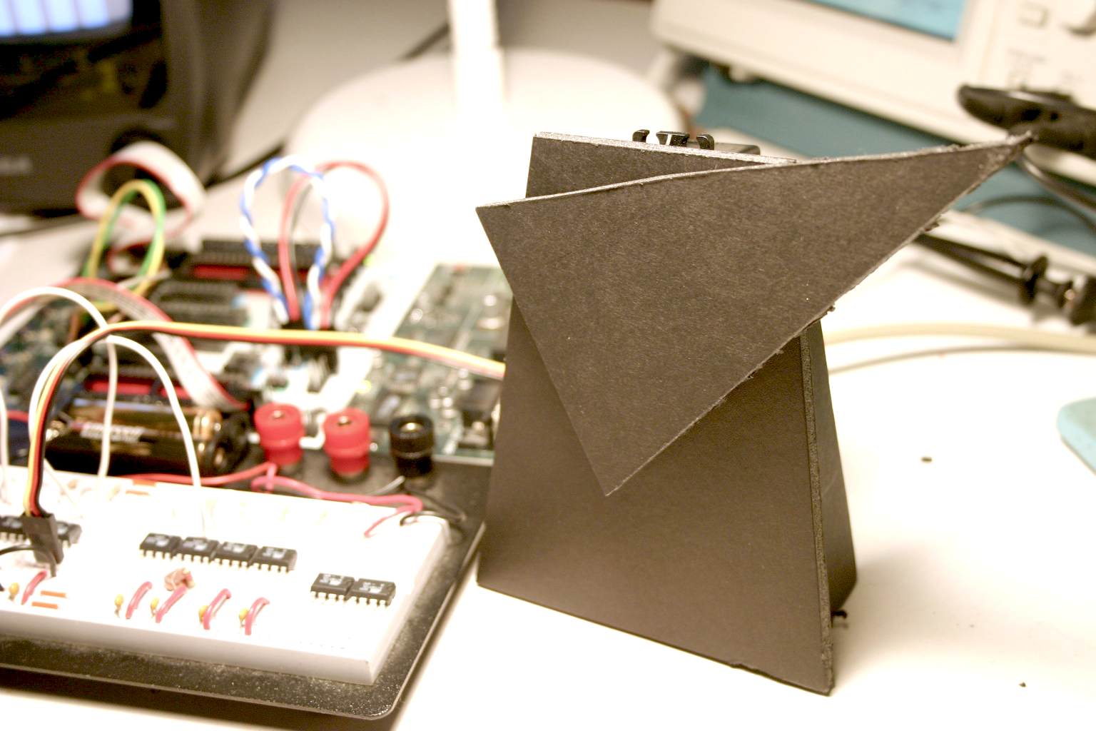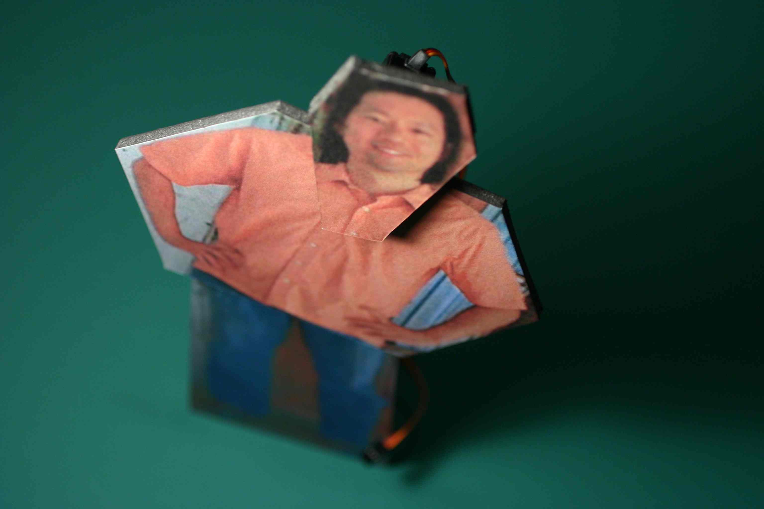 Our friends at DorkbotPdx have gotten us interested in the open-source ArduinoBoard. This 15-inch tall animated stand-up cut-out is our first work, called MiniRay. It uses a single Arduino in place of a handful of Cybords.