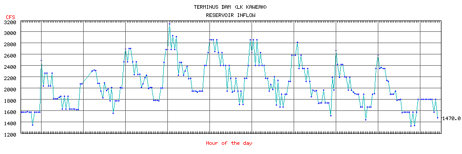 Note: the noise that appears on the hourly flow graph that comes from Calif. Snow Surveys is a result of the method used to calculate the flow on the Kaweah River. Rather than reading a gauge directly, the Inflow is computed by adding the outflow of the dam to the computed net inflow based on the measured reservoir height (and resultant storage) and adjusted for losses due to calculated evaporation based on temperature, humidity and wind travel. Any bobble in the least significant digits of the reservoir height ends up in calculated flow error. This error is eliminated over the course of a 24 hour measurement. At extremely low flows the percentage error is the highest. This amplified error can be seen when the flows are in the 500 cfs and lower range.