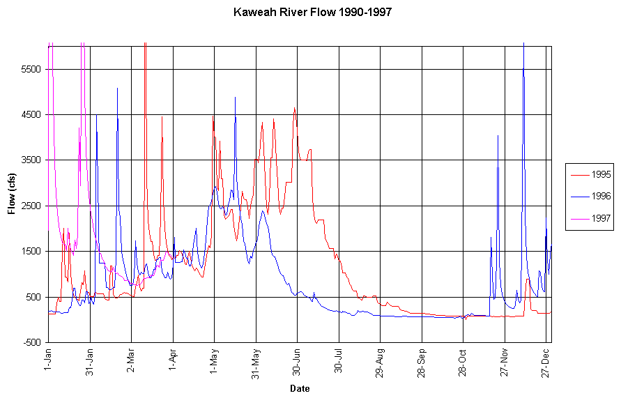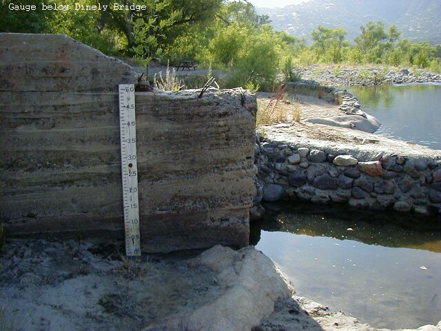 The Gauge that was on the Footing below Dinely Bridge was washed away in the Jan.'97 Flood. A New Gauge was installed on May 20, 1997. While the new gauge is calibrated to the old location, the river channel has been rearranged and the new readings do not correspond to the old ones. A new reading of 1.8ft yields the same flow as an old reading of 2.4ft