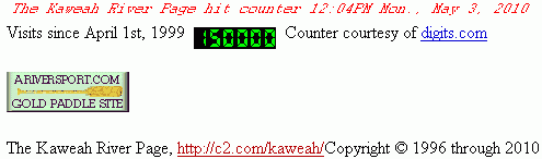 • 05-03-10 The Kaweah River Page reached 150,000 hits at 12:04PM Monday. The lucky visitor is from the IP address at 65.254.33.xxx located somewhere near Atlanta, GA. The visitor who had the 149,999th hit at 11:41AM at IP 142.58.115.xxx in the San Francisco, CA area tried in vain to get the 150,000th hit by reloading the page 6 times but was denied the victory because the hit counter ignores multiple consecutive hits from the same source. The screenshot of the hitcounter was recorded for posterity as it happened.