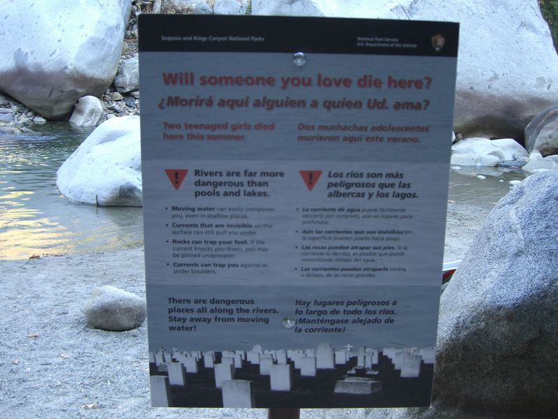 • 06-25-10 THERE WAS A FATALITY ON THE KAWEAH ON MONDAY, JUNE 21st. The victim was a 21 year old man from Florida on a commerical raft trip with All Outdoors. The flow was 1.7 feet on the Dinely Bridge gauge and the water temperature was 50 degrees. The account that was heard goes something like this. I will try to be as general as possible as I was not there first hand and this is a third hand account. The second of two rafts flipped at the bottom of Powerhouse. The resulting swimmers were separated with most on the left side in the moderate rapid below Powerhouse and the victim was swimming the right side. The left side is the more serious water with substantial bedrock and stronger hydraulics and with far fewer opportunies to get out. While rescue of the swimmers was being facilitated by the upright raft on river left, the victim was in a position where self rescue was the only option. Evidently he did not make it to the right bank before being swept down the right channel at Cyanotic. The further right one can get in the 1/4 mile rapid between Powerhouse and Cyanotic the less problematic is a normal swim as the current lessens to the far right. A far right side swim is in Class 2/2+ water with a couple of short class 3's until one enters Cyanotic where the rapid suddenly turns Class 4 with powerful hydraulics and one very large right channel wide pourover hole. Another 150 yards of very big whitewater follows the large hole until the river turns Class 2+ again. The cause of death listed by the coronor was blunt force trauma.