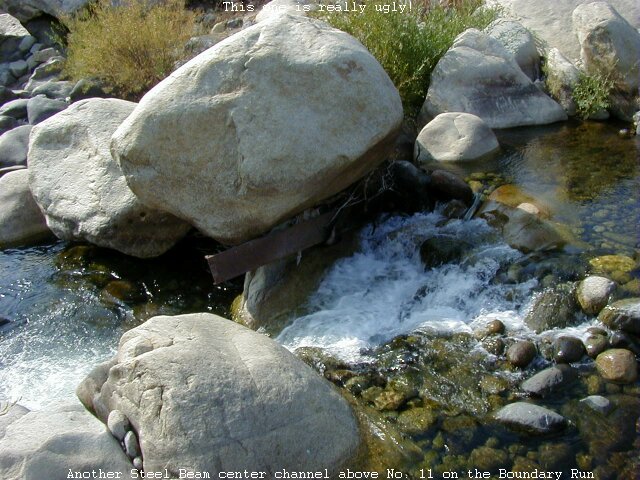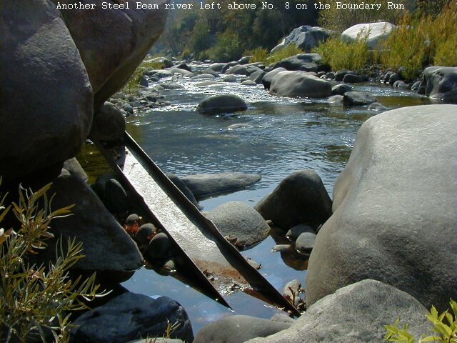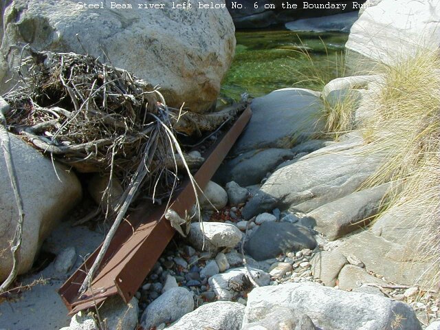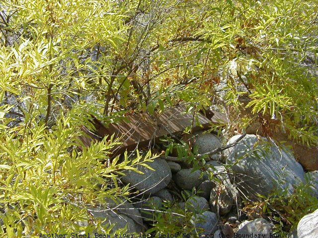 • 11-01-02 More Steel beams in the river up on the Boundary. These beams were documented in late Oct. 2002. Photos 1 , 2 , 3 , 4 , and 5 . All this steel in the river is probably compliments of Southern California Edison Company. There ought to be a law, If you lose your bridge then you got to find and remove all the pieces from the river at no matter what the cost. There are at least another dozen known major pieces of steel in the river in the mile below Pumpkin Hollow Bridge. Not to mention the reminents of bridges destroyed in the 1955 flood.