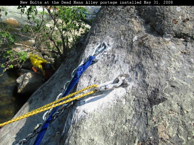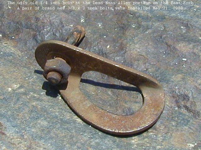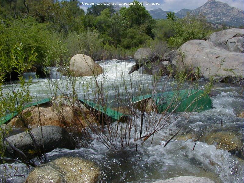 • 05-16-01 As of 5-15-01 there is an fiberglass Canoe wrapped around the rocks below the first slot in the right channel of Bumper. It is still there in the spring of 2002.
