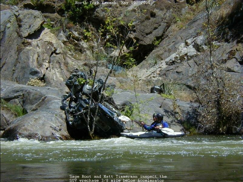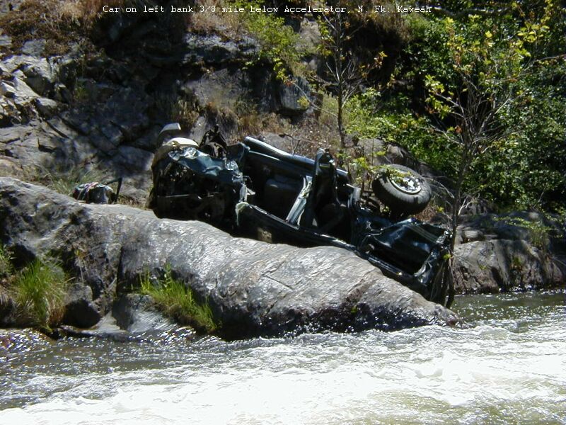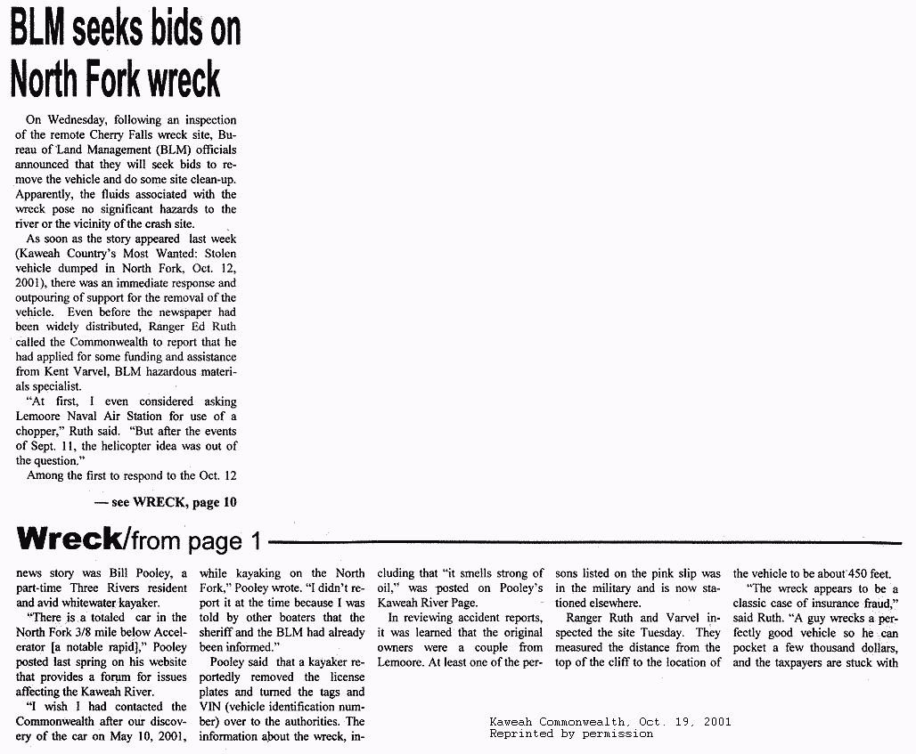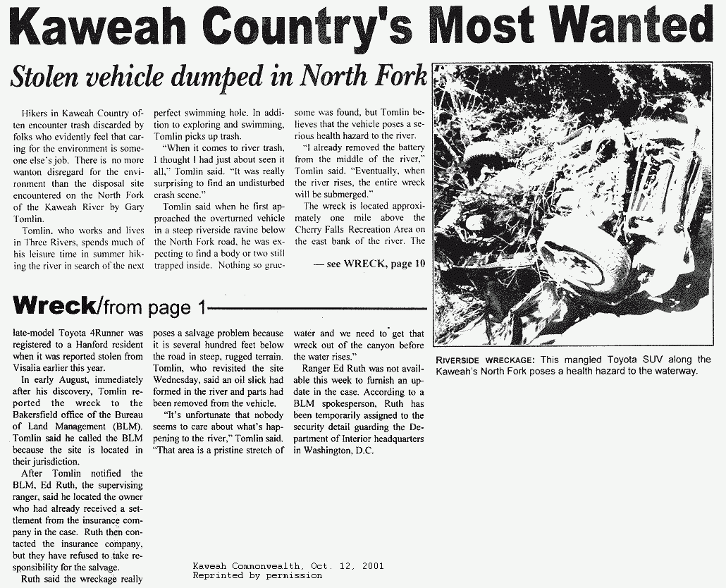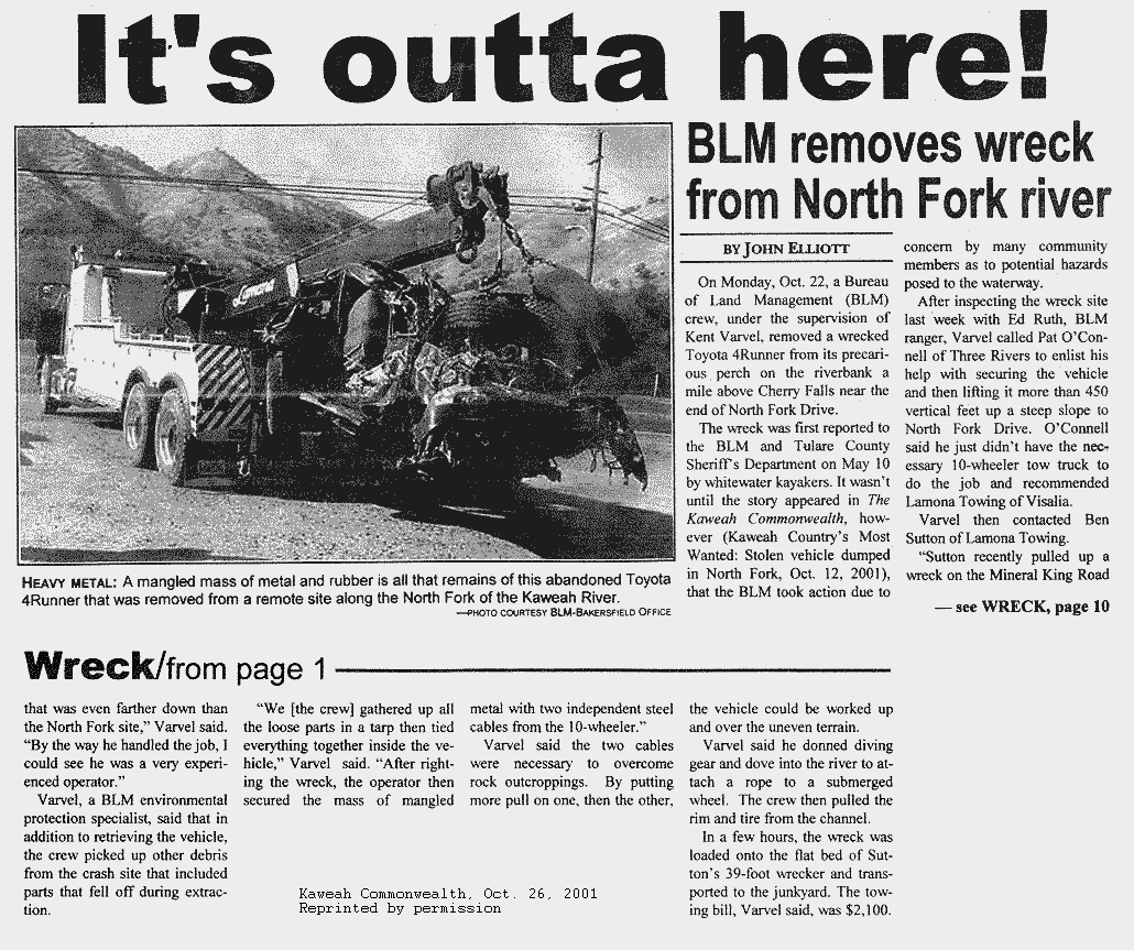 • 10-17-01 The Totaled Car in the North Fork 3/8 mile below Accelerator has been removed by the BLM. The Kaweah Commonwealth Article, Oct. 12, 2001 . created enough of an outcry that the BLM acted promptly and had the wreck removed from the canyon on Oct. 22, 2001. The BLM is to be commended and thanked for their action! Thanks also go out to Gary Tomlin of Three Rivers for reporting the wreck and the Kaweah Commonwealth for their reporting of the wreck. This environmental disaster was previously reported on the Kaweah River Page May 10, 2001. Here's another Picture of the Wreck from the May 10, 2001 kayak trip on the North Fork and reprints of the Kaweah Commonwealth articles from Oct. 19, 2001 (BLM gets ready for the wreck removal) and Oct. 26, 2001 (BLM removes the wreck)