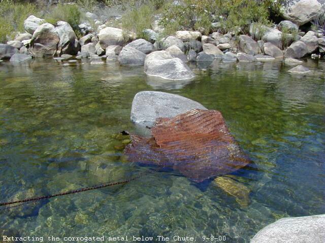 • 09-11-00 A large and ugly piece of a metal building was recently removed from the river below the Chute. The metal appeared after the Jan. 1997 flood. We know it's a metal building because the padlock is still on the door. Removing the metal: Image 1 , Image 2 , Image 3 , Image 4 .
