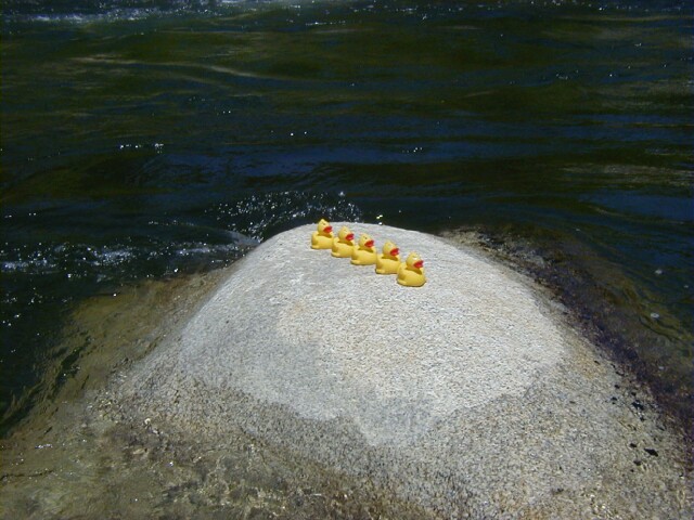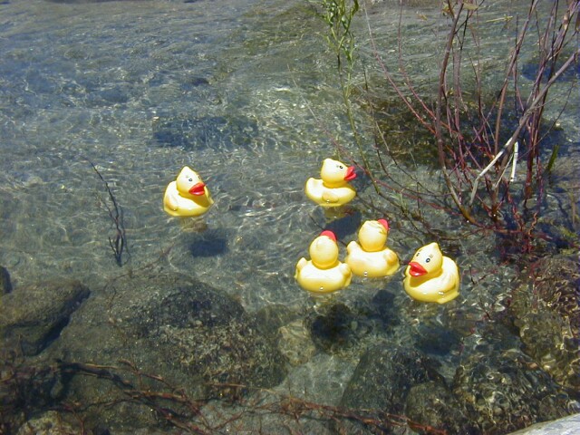 • 05-17-02 Yellow Rubber Ducks on the river. So far 9 coveted numbered yellow ducks have been recovered from the river following the rubber duck race held in early May 2002. The race started with 96 ducks, most of which went nowhere fast and eddied out anywhere and everywhere. Sometimes they are seen swimming. Other times they just hang out on a rock in the river. Send your yellow ducks to the webmaster.
