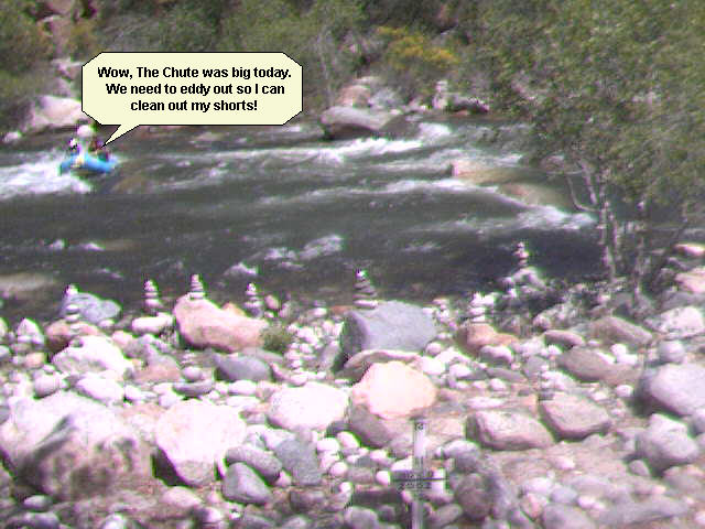 • 05-01-02 Old but good news. The Janet Reno Piton Rock in Powerhouse has moved downstream 15 feet to a safe and stable position nearly in the pool below. The center channel is safe (but still knarly) to run again. The rock has repositioned itself with both favorable location and angle. Rafters report the rock is still in the way but not as bad as before. There is more room for a raft to the left side of the rock. The void created by the rocks movement has created a new hydraulic with another surprize rock below the main pourover. The webmaster has personally T-boned this hidden underwater obstruction more than once even at higher flows of 1.4 ft. Avoid the T-Bone by staying right. See Photo.