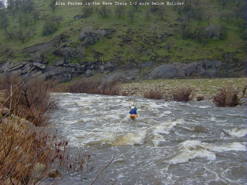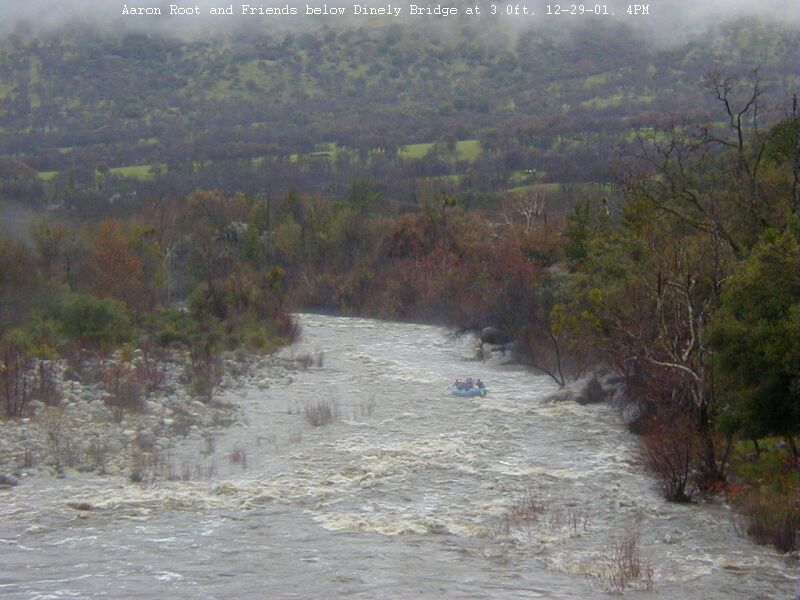 • 12-29-01 Aaron Root and his buddies rafted the Kaweah at high water on 12-29-02 . By the next day the flow was down and Alan Parker and myself ran from Gateway all the way into the lake bottom through the seldom run Wavetrain one quarter mile below Lower Holiday .