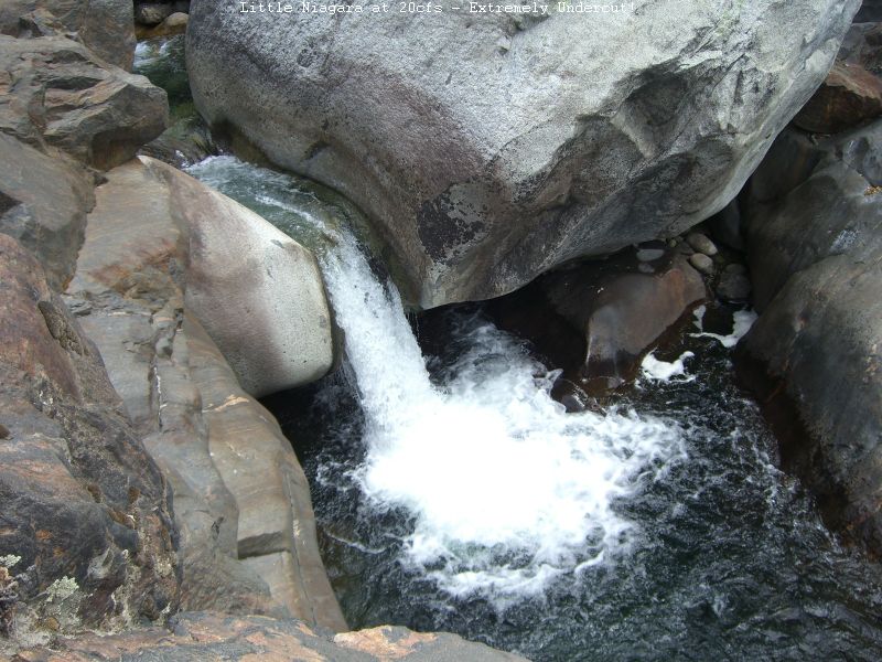 • 10-26-09 In early September a trip to the Hospital Rock venue at 25 cfs found that Little Niagara is extremely undercut explaining how paddles are often lost in this drop. It can scare you to see what the riverbed looks like without water in it. Little Niagara would not be a place you would want to find yourself in the undercut behind the falls!!!