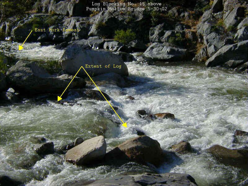 • 07-02-10 There is a hazard dangling over the diversion dam at the Park Boundary. It is the Edison Company log boom that guards the intake facility for the flume serving Kaweah Plant No. 2. It has been there ever since the peak flows washed it out and does not seem to be going away anytime soon. It is being held in place by the chain still attached to one end of the boom and the other end of the chain attached to the top of the dam. As the boundary drops to runable levels in the next several weeks be aware of this hazard. The log boom is only a few feet right of the line that is normally taken to run the dam.