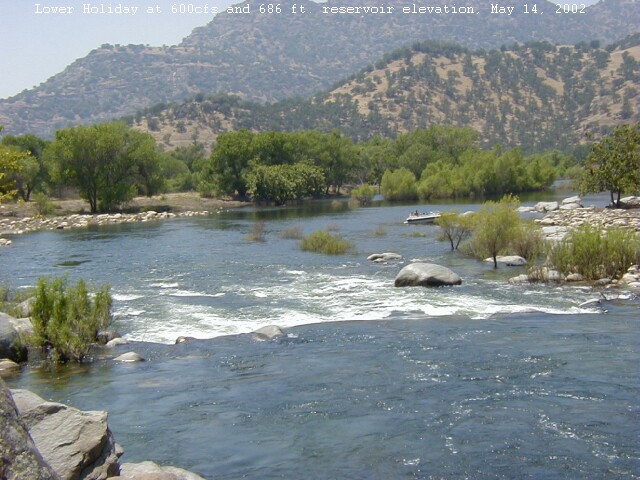 • 06-05-03 It is speculated that the reason the lake is not filling this year is because of the work on the spillway at Terminus Dam and the Hwy 198 bridge at Horse Creek in preparation for the raising of the lake by 21 feet. The bad news is the future lake levels will bury both Upper and Lower Holiday rapids completely. The good news is the Holidays are runnable all this season for the first time in years.