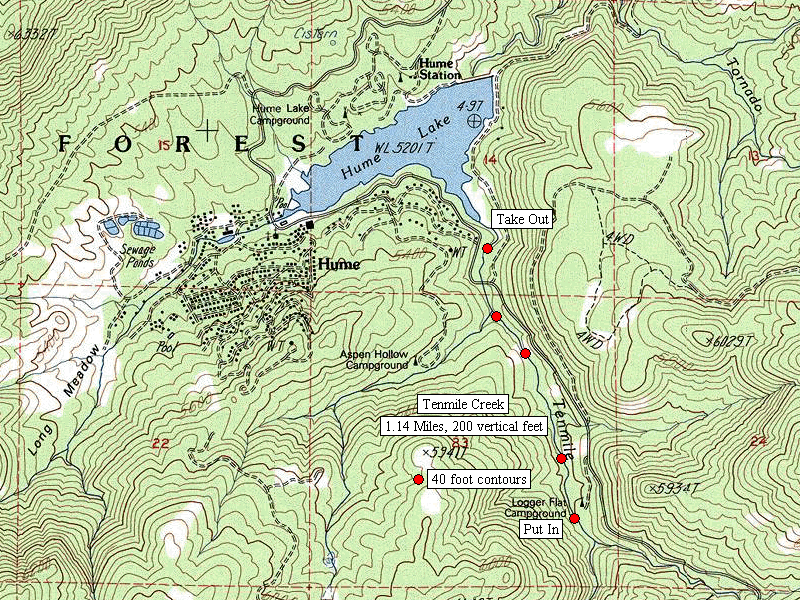 • 09-01-10 The Upper-Upper North Fork run will now be called the "Cherry Flat Section", so named by those who first descendedit this past june. The 5 mile run lies above the Upper North Fork walk-in run above Yucca Creek and is accessed by Forest Service roads above Badger and a 30 minute hike to the river on a trail from the Cherry Flat area. The first 3 miles are very steep with one mile at 600+ feet/mile and the whitewater is extreme by any measure. Surely this section is destined to became another Kaweah classic.