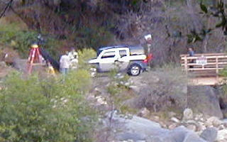 • 12-29-01 Is this Next Years SUV ? The KRP has received exclusive Paparazzi photos from up on the Park Boundary. Hostile guards were alledged to follow the every move of the Paparazzi as he was able to get within only 200 yards of the event. This was a full blown photo production with a cast of dozens and neither visitors, cameras nor questions were welcome. The vehicle came under drapes seconds later. These guys even draped the river gauge with camo cover.