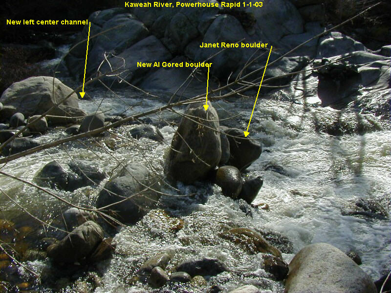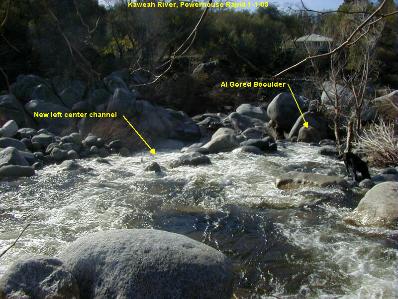 • 01-02-03 The Kaweah River Webcam is back. Scroll down a tad and you'll see the image. Powerhouse rapid was personally inspected by the webmaster after the Nov 8th flood. It is not as bad as previously reported. While it is true that the right side of the center channel is quite ugly after the arrival of the Al Gored boulder mounted high and above the Janet Reno boulder, the flood has removed a portion of the island separating the center channel from the left channel. The new 'left center' channel appears to be a straight shot, joining the flow from the left channel 60 feet upstream from the Al Gored rock. These pictures will make it clearer (maybe). Photos are taken at a flow of 250 cfs @ Threerivers. Powerhouse 1 is taken from the bank right of the center channel looking to river left, Powerhouse 2 is taken from the top of the center channel looking downstream, Powerhouse 3 is taken from the top of the center channel further upstream looking downstream, Powerhouse 4 is taken from adjacent to the Al Gored boulder at the bottom of the right center channellooking to river left, Powerhouse 5 is taken from below the center channel looking upstream,
