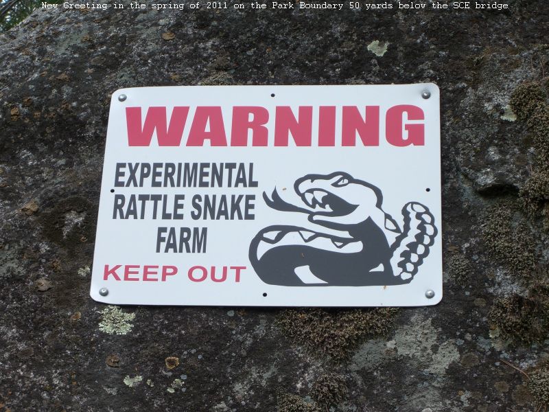 • 02-12-11 The owner of the land river right immediately below No. 2 on the Park Boundary obviously does not want anybody on his land. The strange notification comes by way of a sign affixed to a boulder 50 yards below the SCE bridge with the words: WARNING Experimental Rattlesnake Farm Keep Out. Word has it that the landowner will be building a house on the newly cleared area on a slight knoll on the right bank between rapids No. 2 and No. 3. While a great site with a great beach of granite slab, the summer usage of the adjacent Edison Company land at the bridge by quantities of garbage leaving, graffiti marking, undesireable, and unrespectful beachgoers will surely be causing them concern. The site rivals the Edison beach below Dinely Bridge where the ongoing war between landowners and beachgoers is an annual summertime issue. The Park Boundary run will lose some of it's remote quality down the road.