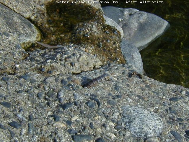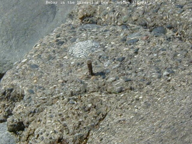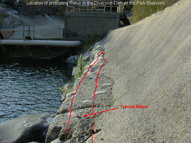 • 11-01-02 The Dangerous Rebar that peppered the downstream face of the Diversion Dam at the Park Boundary has all been bent downstream to a safer form. There are 7 pieces of rebar protruding between 1.5 and 3 inches on the ski jump portion of the downstream face located 3, 6, 12, 15, 35, and 39 feet left of the 3 foot long rebar that stands vertical on the lip of the dam near center stream. Another piece is located about 5 feet off the far left edge of the dam. It is unbelievable someone had not yet ripped a hole in the bottom of their boat running the diversion dam, especially considering the rebar that's 6 feet left of the 3 foot vertical piece. This is right where people normally run the dam! Sage reports running the dam 4 feet off the left wall. That too had a very nasty piece sticking out 2 inches. Here are three photos of Typical Rebar Before and Typical Rebar After and the Rebar Location Zone Ultimately, all these hazards need to be cut off with a hacksaw flush with the rock but the present solution is a major improvement.