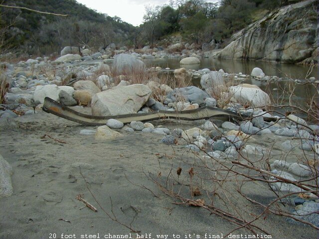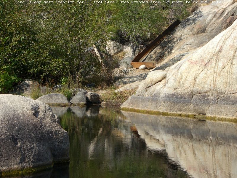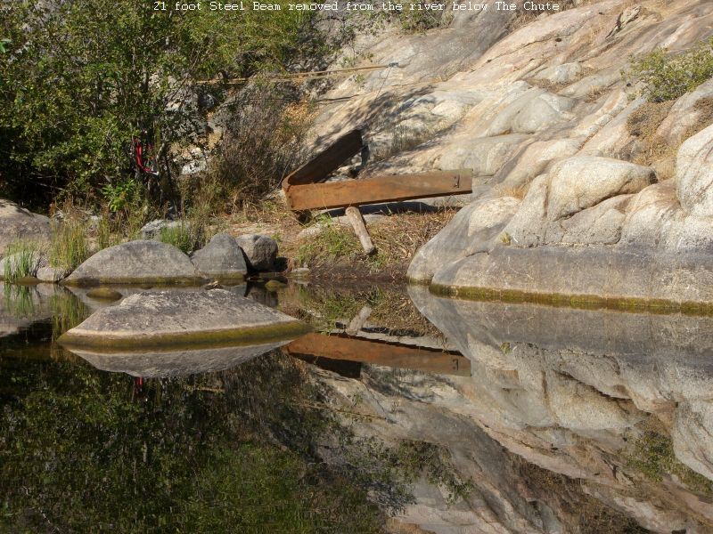 • 09-28-09 A 21 foot long, 620 pound, 12x3 inch Steel Channel Beam was discovered 100 yards below The Chute. It took five days of work to get the beam out of the river and winch it 100 feet downstream and up onto the right bank into a 500 year flood safe location. The next flood could have sent this hazardous debris downstream where it could have become lodged in a dangerous location between some of the mega boulders in Headwall Rapid and right in the path of boating. Hopefully we can get this beam cut up into smaller pieces someday for easier permanent removal from the river vicinity. There are about 20 more steel beams similar to this one scattered in the two miles below the Southern California Edison Bridge at the Park Boundary. That bridge partially washed out in the flood of January 1997 leaving alot of hazardous steel in the river ever since. At least one beam is in a very dangerous position crosswise to the current in the middle of a commonly run drop above No. 11 on the Park Boundary run. You can follow the beam removal project with this series of three photos.