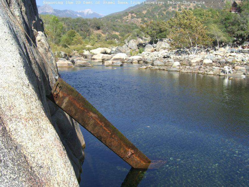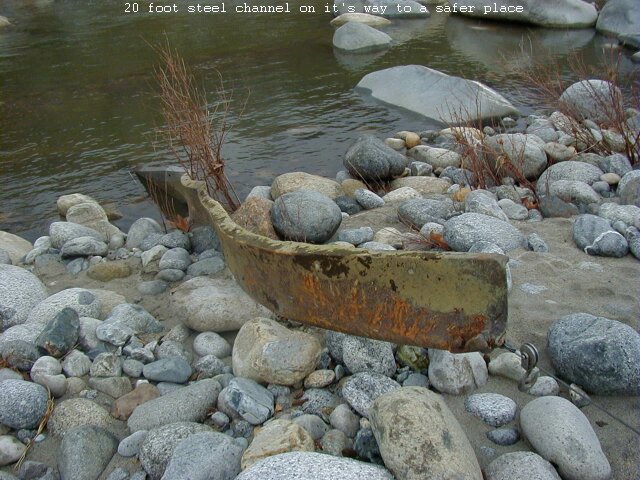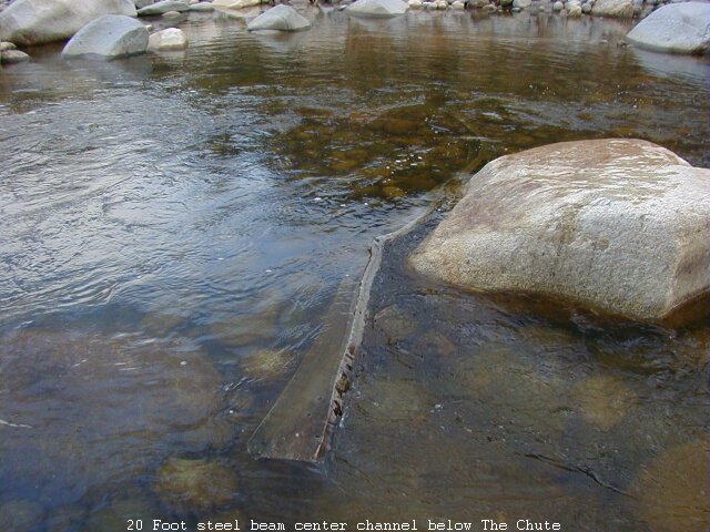 • 01-02-03 Nov 8th flood brings steel beam down The Chute. It was removed 12-29-02 by winch from it's dangerous position crosswise in the channel. Photos 1 , 2 , 3 , and 4 of the removal of the beam.