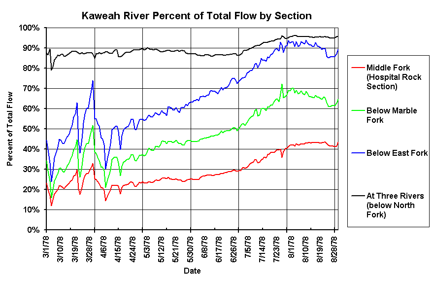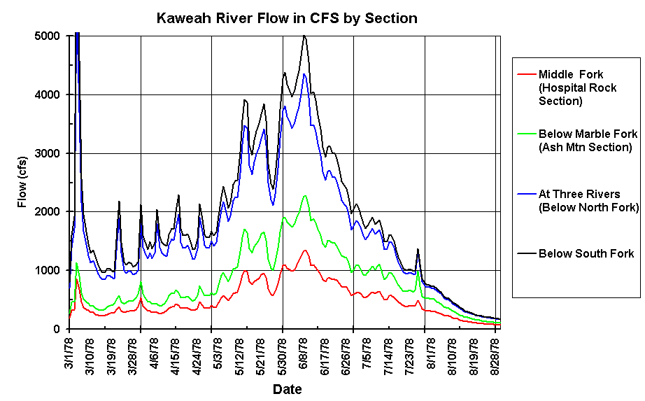 The Kaweah has significant changes in the contribution from the various tributaries depending on the time of year. Early in the runoff season, the North Fork is a major contributor and by the end of the runoff the main contributor is the Middle Fork. What this means is that the CFS Inflow to the Lake does not necessarily represent the actual flow at any one time on any one section. Additionally there is a large Flow Variation over the course of the day with the peak occurring around midnight and the low at about 6PM. Variation over the course of one day can be a high of 50% more than the low. Variations on the Dinely Bridge gauge can be half a foot or more at higher flows.